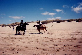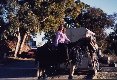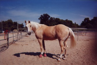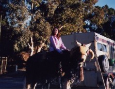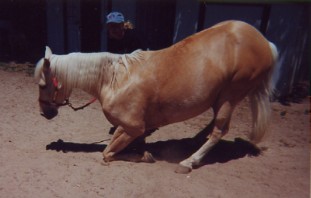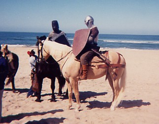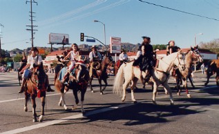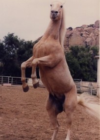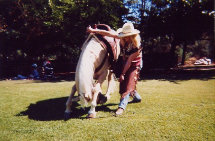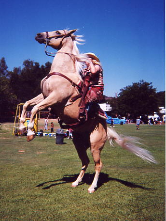 Wonder Horse" at Calamigos Ranch in Malibu, performing at a picnic, About Billy the Kid HOME page Thanks for visiting Casey's page which is linked off of my personal web site about the West's most famous outlaw: Billy the Kid, by Marcelle Brothers (me). Aside from my horse hobby, I'm a American History and Billy the Kid enthusiast. So after constructing my web site on Billy the Kid, I couldn't resist the urge to dedicate a page to my special horse -Casey. Let me tell you a little about his background. When I first bought Casey sixteen years ago, he was a packhorse on a dude ranch in Colorado. When the summer was over he was brought down to Chino, California, where I bought him. He was a mess and a sad sight, he was underweight, shaggy, covered in wounds and sores, and he wasn't well broke under saddle, but we clicked with each other and I bought him. After six months of TLC, he looked like an entirely different horse. No longer the sorry looking nag he once was, but he had his spirit back and was flashy looking. His coat lost it's dull color and turned shiny gold, and his short, yellow stained mane and tail was now long and snow white. Wherever we went, we turned heads. I immediately noticed Casey's intelligence and willingness to please, so to break the monotony of riding on the same trails and going around and around in an arena, I began trick training Casey just for fun. I was influenced by the old B-westerns, particularly Roy and Trigger, so through trial and error (and lucky enough to have a patient horse) I had Casey performing tricks as good as Trigger. We have performed at special events such as picnics, wild west shows, parades, and we've done some movie work. Hopefully, one day Casey will have his big break and star in his own movie, and maybe even have a Breyer horse made in his image. Tricks and Behaviors Casey can perform tricks both under saddle and at liberty. His tricks consist of the rear (both in the saddle and at liberty), bow, kneel on two knees, chest bow, dance the Rumba, Spanish walk, paw the ground on cue, nod his head yes and no, look and turn his head to the left or right, smile by curling his upper lip up, open and close doors or lids, kick on command. At liberty (free with no lead line) he can come, stop, stay, back-up, and look to the left or right all by hand signals or verbal command. Also, he has a wonderful sweet personality and he is utterly fantastic with people, particularly with kids- he's a real people horse. Movie credits "The Four Diamonds" 1995, (Disney cable movie). For this project Casey reared, did some liberty work and a jousting scene on the beach. This movie was shot in Florence and Three Sisters, Oregon. "Turbo Rangers: The Movie" 1997 (feature film). For a small role, Casey was dressed as a alien like creature, and canter through a forest chasing a midget actor dressed as a troll. This movie was shot at Griffith Park in Burbank, California. "Total Fear", 2003 (Animal Planet Channel /mini-series documentary on animal phobias). The stunt required Casey to rear, pivot on his hind legs, and gallop away due to a cowboy's overreaction to a snake. I doubled for the cowboy and also shot camera footage for the cowboy's view on horseback. It was filmed at Stony Point Park in Chatsworth, California. Casey has also worked on a promo for a TV movie called Fire Rider, from Here Me Roar Productions Here are some photos of Casey the Wonder Horse....